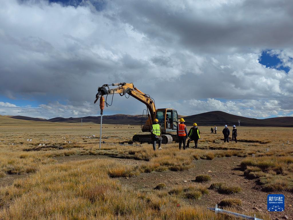 在西藏華電那曲色尼區(qū)12萬千瓦光伏發(fā)電電力保供項(xiàng)目工地,工人們正安裝螺旋樁。(受訪單位供圖)
