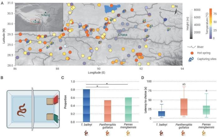 中國科研人員結(jié)合野外調(diào)查和文獻(xiàn)調(diào)研,整理了高原地?zé)豳Y源以及溫泉蛇的分布信息,發(fā)現(xiàn)溫泉蛇高度偏好溫泉生境。通過趨熱行為學(xué)實驗證明,相較于另外兩種低海拔蛇類,溫泉蛇能夠更快速地定位到高溫區(qū)域,且對高溫區(qū)表現(xiàn)出強(qiáng)烈的偏好,提示溫泉蛇具有高效的溫度感知能力。