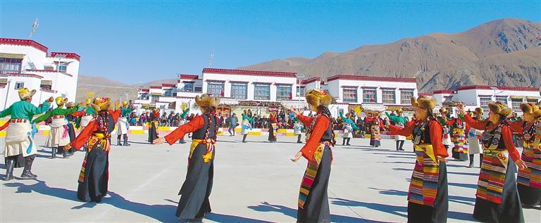 文藝事業(yè)繁榮興盛,全區(qū)共有10個專業(yè)文藝團(tuán)體、76個縣區(qū)藝術(shù)團(tuán)、153個民間藏戲隊(duì)、395個鄉(xiāng)鎮(zhèn)文藝演出隊(duì),所有行政村成立群眾文藝演出隊(duì)。圖為西藏自治區(qū)扎囊縣德吉新村群眾文藝演出隊(duì)開展演出活動。