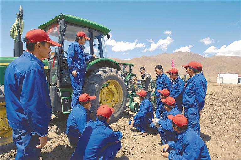 發(fā)展教育脫貧一批。2016年以來,累計落實(shí)義務(wù)教育學(xué)校基本建設(shè)資金84.4億元,實(shí)施教育基礎(chǔ)建設(shè)項(xiàng)目1433個,資助建檔立卡和農(nóng)村低保大學(xué)生累計6.06萬人次,落實(shí)資助資金3.55億元。圖為西藏自治區(qū)白朗縣邀請山東農(nóng)機(jī)技師對當(dāng)?shù)刎毨糸_展培訓(xùn)。