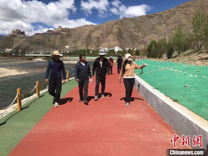 圖為寧樣(右一)檢查玉樹市樹木生長情況?!∮駱涫形麄鞑抗﹫D