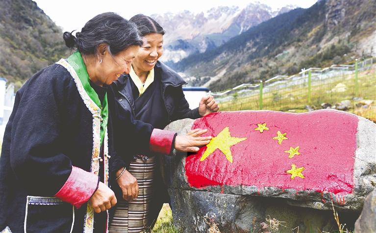 圖為“家是玉麥,國是中國”,人人爭做神圣國土守護(hù)者、幸福家園建設(shè)者。圖為“七一勛章”獲得者卓嘎和同為“時(shí)代楷?!钡拿妹醚胱诘诌呇策?。