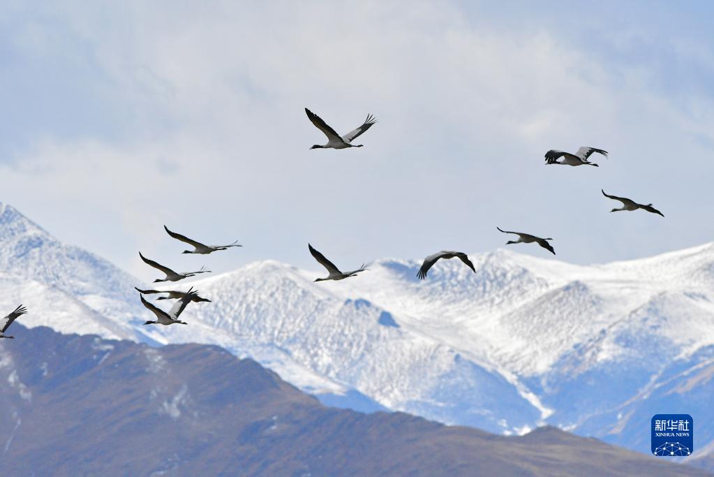 黑頸鶴群飛過林周縣強(qiáng)嘎鄉(xiāng)境內(nèi)山梁(11月6日攝)。新華社記者 姜帆 攝