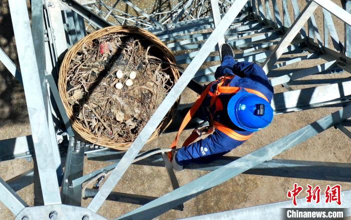 圖為高原猛禽在人工鳥巢內(nèi)“安家”?!W(wǎng)青海省電力公司供圖