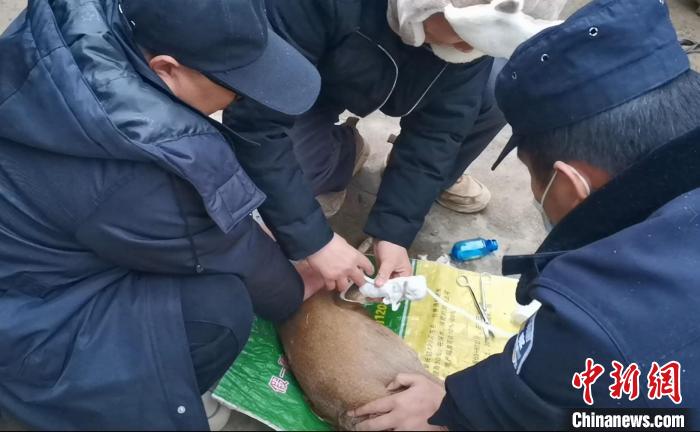 圖為移民管理警察與獸醫(yī)站人員為赤麂包扎傷口。 肖應天 攝