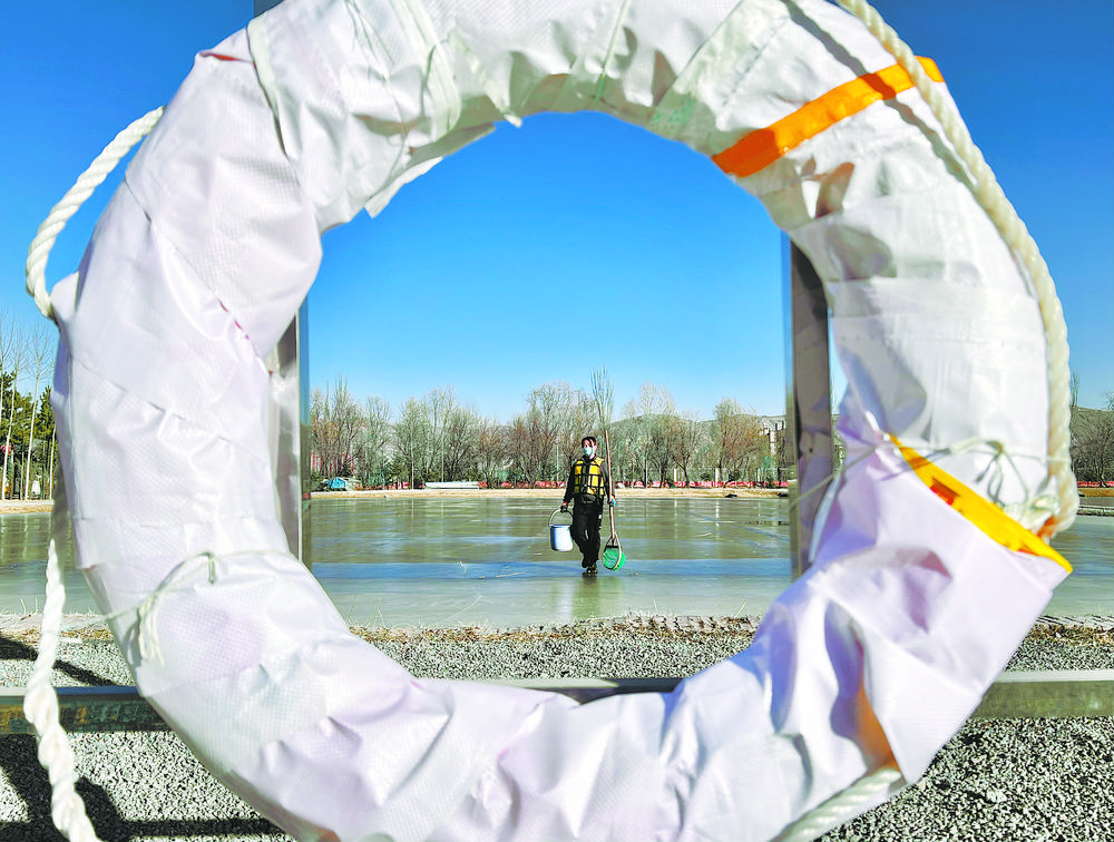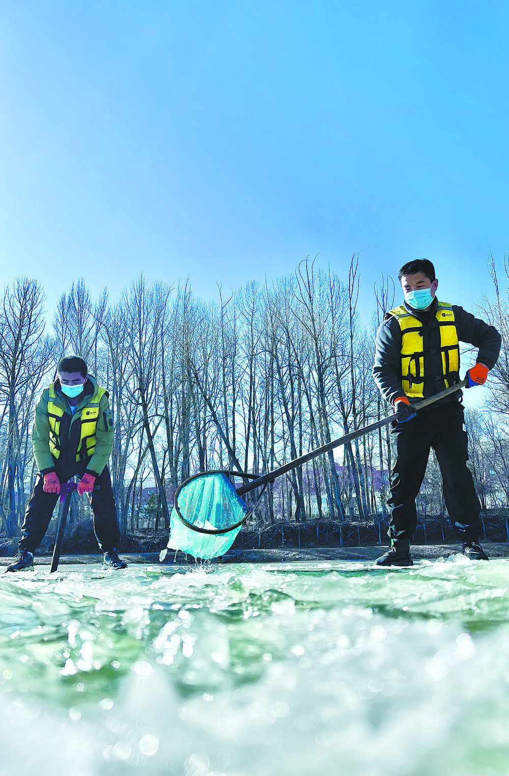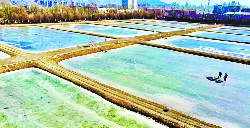 陽光透過冰面照射在18口冰封的魚塘里,為過冬的小魚苗增氧增溫。這片池塘是裸鯉來到裸鯉救護(hù)中心的第一站,田文根是這里的一名工作人員,主要負(fù)責(zé)室外原種場魚苗的培育和水質(zhì)監(jiān)測工作。據(jù)他介紹,魚塘的水質(zhì)決定著魚苗的健康狀況。在冬季,及時掃雪是一項非常重要的工作,因為冰層下面的裸鯉魚苗是靠浮游植物通過光合作用產(chǎn)生的氧氣生存,如果雪附著在冰層上,陽光無法透進(jìn),就容易造成缺氧。