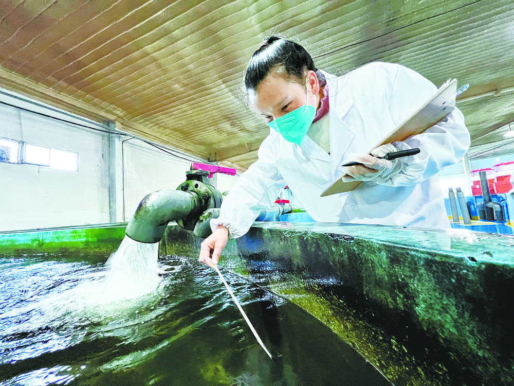 技術(shù)人員記錄循環(huán)水養(yǎng)殖池的水體溫度。