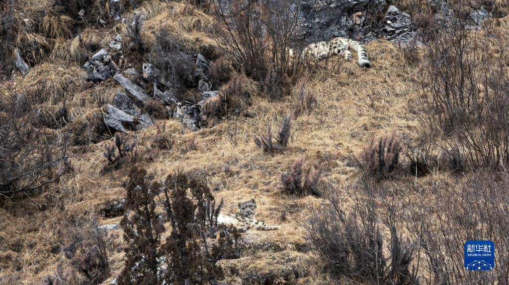 2月21日,在青海省玉樹藏族自治州雜多縣昂賽鄉(xiāng)境內(nèi)的昂賽大峽谷內(nèi),兩只雪豹正在休息。新華社記者 費茂華 攝