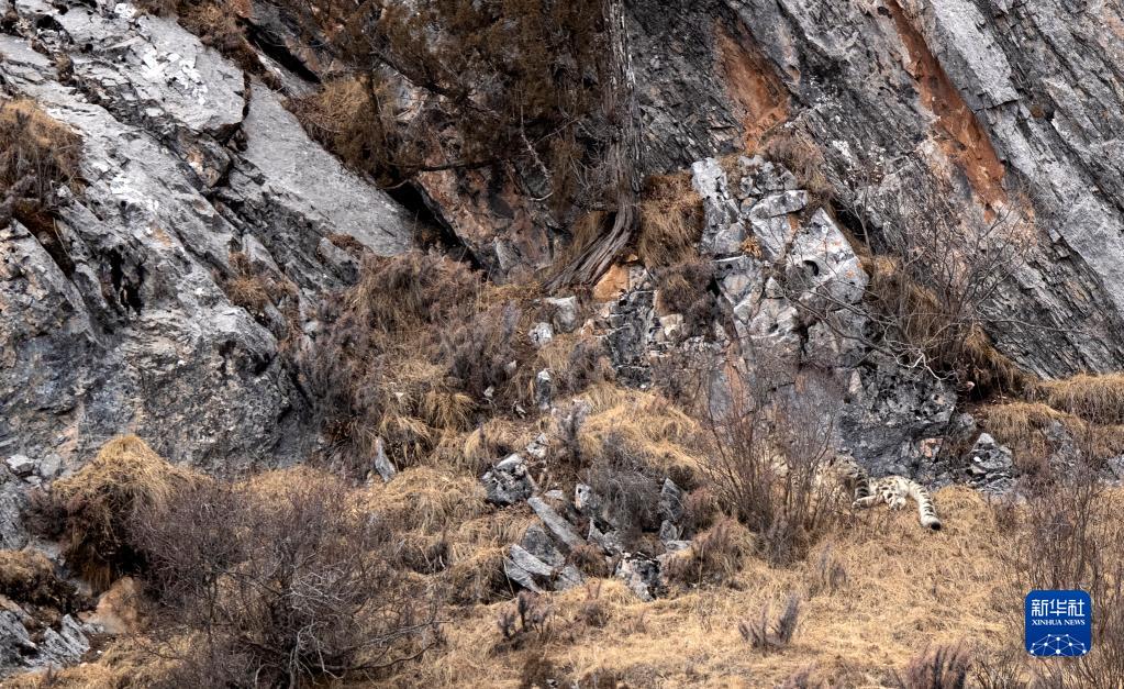 2月21日,在青海省玉樹藏族自治州雜多縣昂賽鄉(xiāng)境內(nèi)的昂賽大峽谷內(nèi),一只雪豹在休息。新華社記者 費茂華 攝