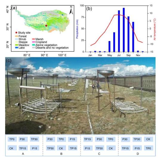 研究站點植被類型(a)、氣象條件(b)和實驗設計(c)。中科院青藏高原所 供圖