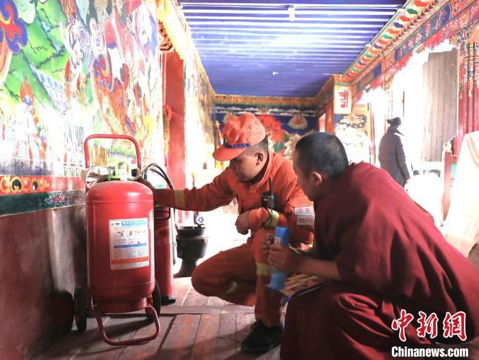 森林消防隊(duì)員檢查寺廟滅火器?!∥骼@拉翁 攝