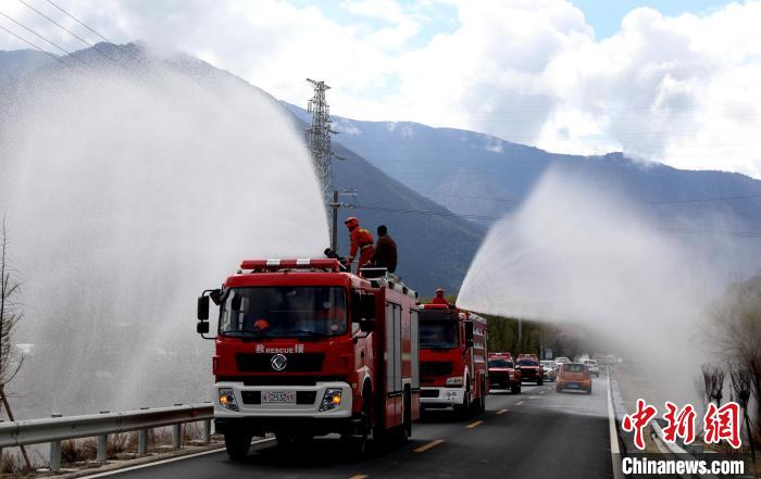 林芝市森林消防支隊消防員正在進(jìn)行灑水增濕作業(yè)?!∥骼@拉翁 攝