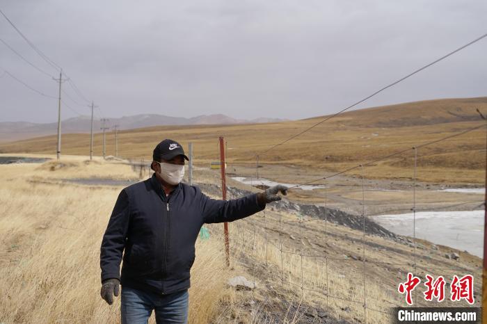 今年3月,久買正在查看種草復(fù)綠區(qū)域的網(wǎng)圍欄。 中新社記者 李雋 攝
