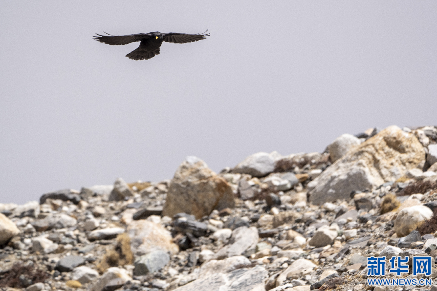 5月13日,在珠穆朗瑪峰登山大本營附近拍攝的黃嘴山鴉。新華網(wǎng) 旦增努布 攝