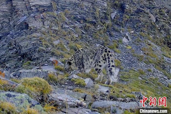 紅外線相機(jī)拍到的國家一級保護(hù)動物雪豹活動影像?!⌒慢埧h林業(yè)和草原局供圖
