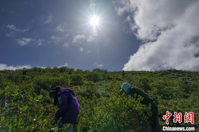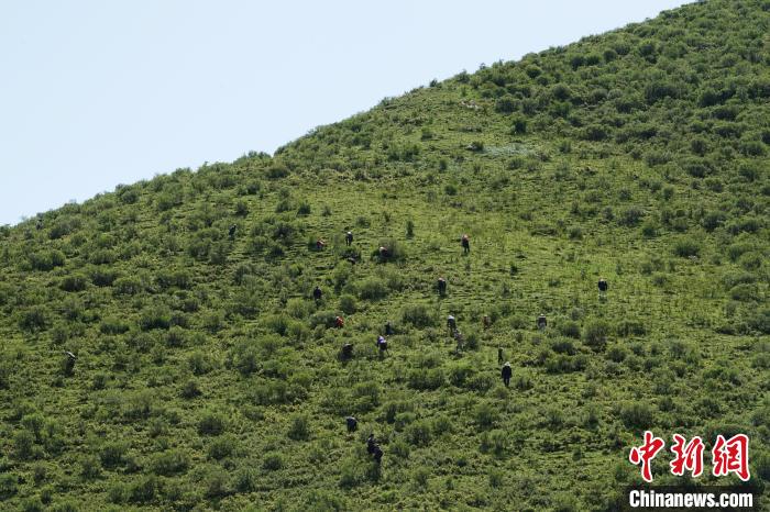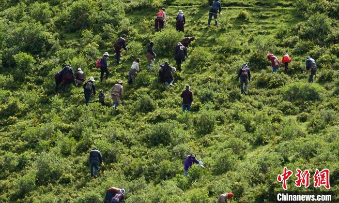 圖為青海省果洛州甘德縣藏族民眾在山間采挖野生貝母。馬銘言 攝