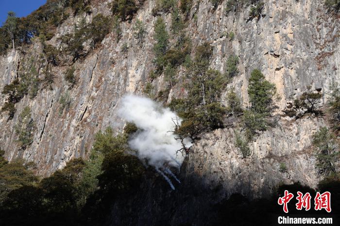 圖為演練現(xiàn)場,無人機投彈撲打懸崖火。王澤棟 攝