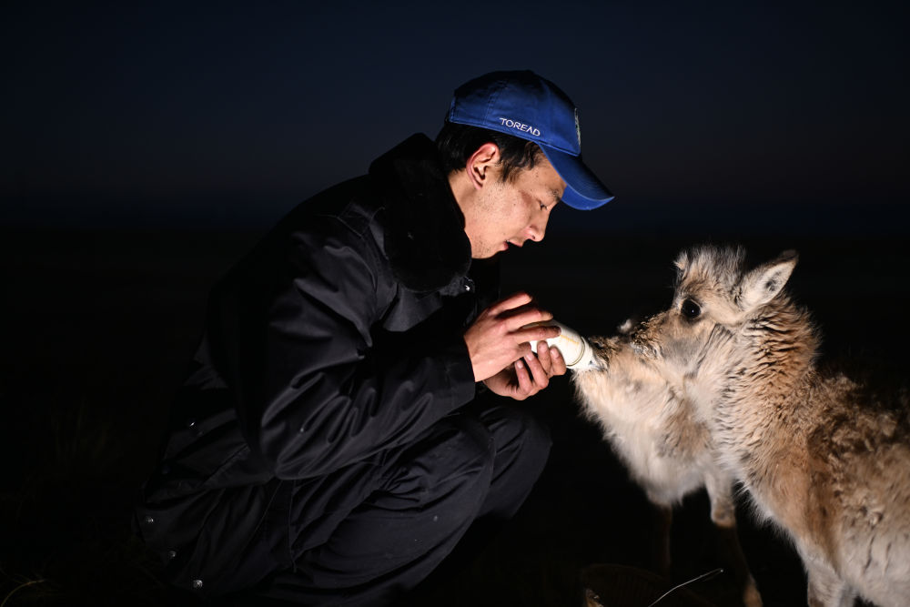 可可西里巡山隊(duì)員才文多杰在索南達(dá)杰保護(hù)站內(nèi)給被救助的藏羚羊幼仔喂奶(1月18日攝)。新華社記者 張宏祥 攝