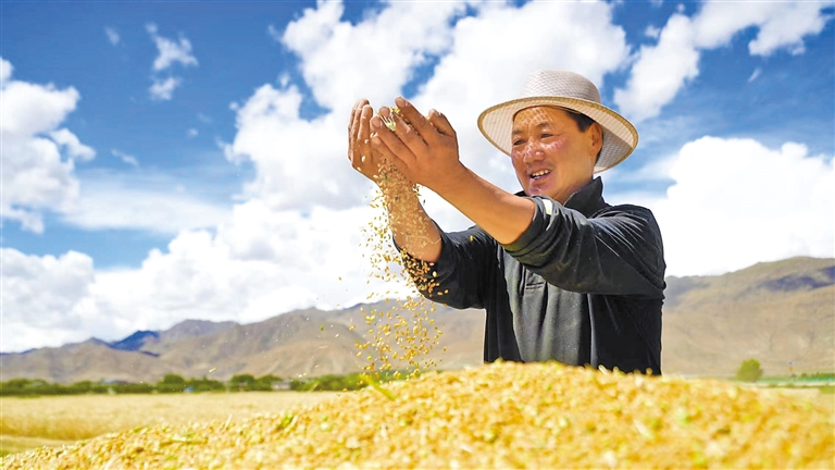 日喀則市白朗縣嘎東鎮(zhèn)馬義村村委會(huì)副主任普瓊手捧豐收的麥粒,高興地說:“高標(biāo)準(zhǔn)農(nóng)田建設(shè)為我們節(jié)省了大量的人力,實(shí)現(xiàn)了農(nóng)業(yè)機(jī)械化,讓未來的生活充滿了希望。”