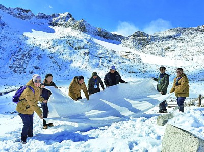 四川阿壩州,中國(guó)科學(xué)院西北生態(tài)環(huán)境資源研究院科研人員在為冰川“蓋被子”。謝宜達(dá)攝/光明圖片