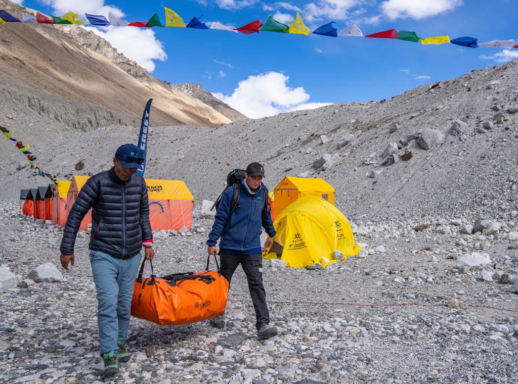 在珠峰登山大本營,弟弟帕斯卡爾·德諾埃爾(左)和哥哥多米尼克·德諾埃爾正在準(zhǔn)備登山物資(5月18日攝)。新華社記者 丁汀 攝