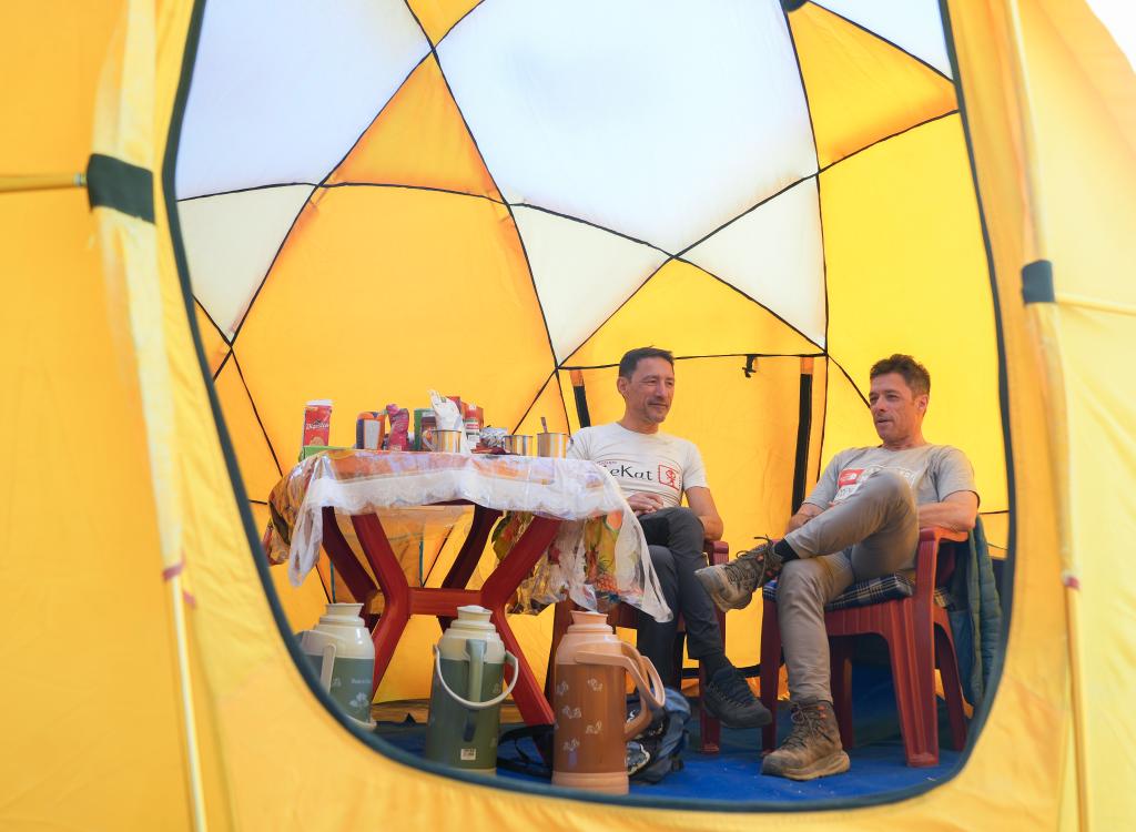 在珠峰登山大本營,帕斯卡爾·德諾埃爾(左)和多米尼克·德諾埃爾在帳篷里聊天休息(5月17日攝)。新華社記者 丁汀 攝