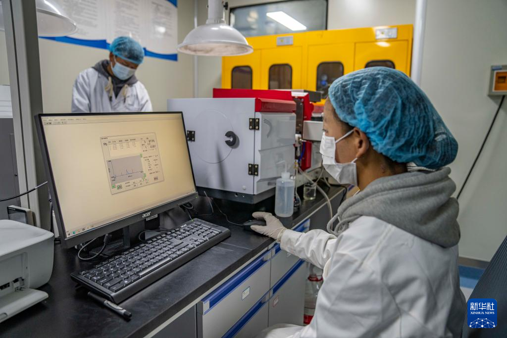 在聶榮縣嘎確生態(tài)畜牧業(yè)發(fā)展有限責(zé)任公司,檢驗(yàn)員達(dá)娃卓瑪在檢測(cè)奶制品(5月13日攝)。新華社記者 孫非 攝