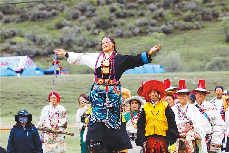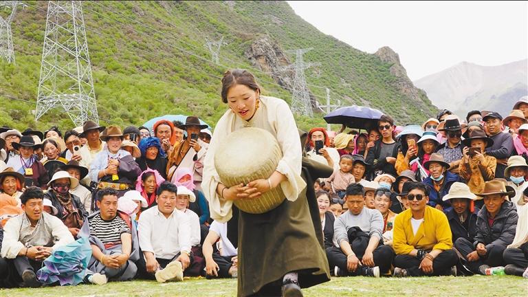 開幕式在藏雄村幼兒園小朋友表演的舞蹈《第一支花》中拉開序幕,唐古鄉(xiāng)、阿朗鄉(xiāng)、旁多鄉(xiāng)對北部三鄉(xiāng)獨特的文化藝術、生態(tài)環(huán)境以及豐富的“非遺”文化進行展示與推介,還有特色服飾展演,他們將秀場搬到大自然,以“傳統民族服飾走秀+‘非遺’文化展示+牧區(qū)生活用具展示”為核心,配以林周縣唐古鄉(xiāng)關于北部三鄉(xiāng)服飾的唱頌詞與鼓點相融合,為展演提供了獨特的音樂伴奏,展現了林周縣北部三鄉(xiāng)豐富的民族文化。