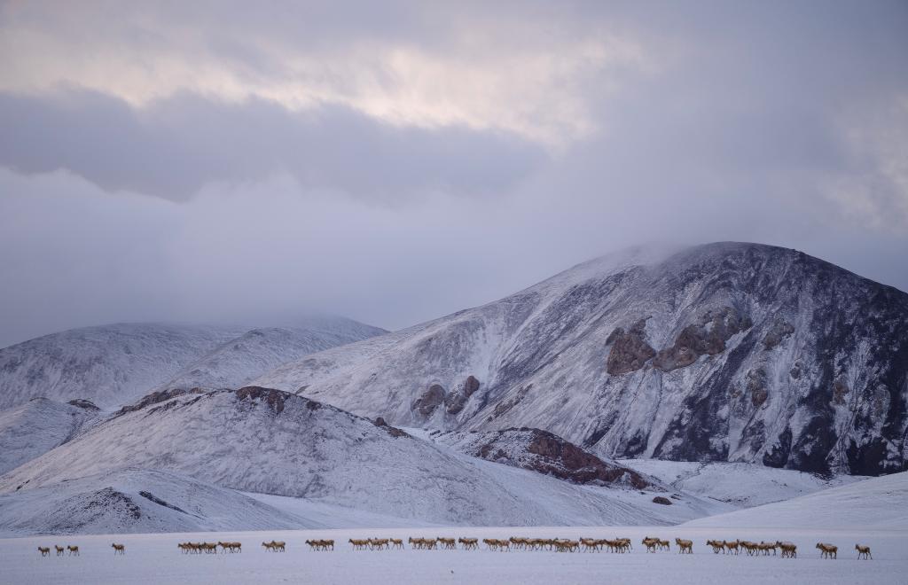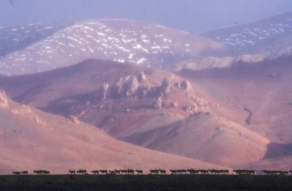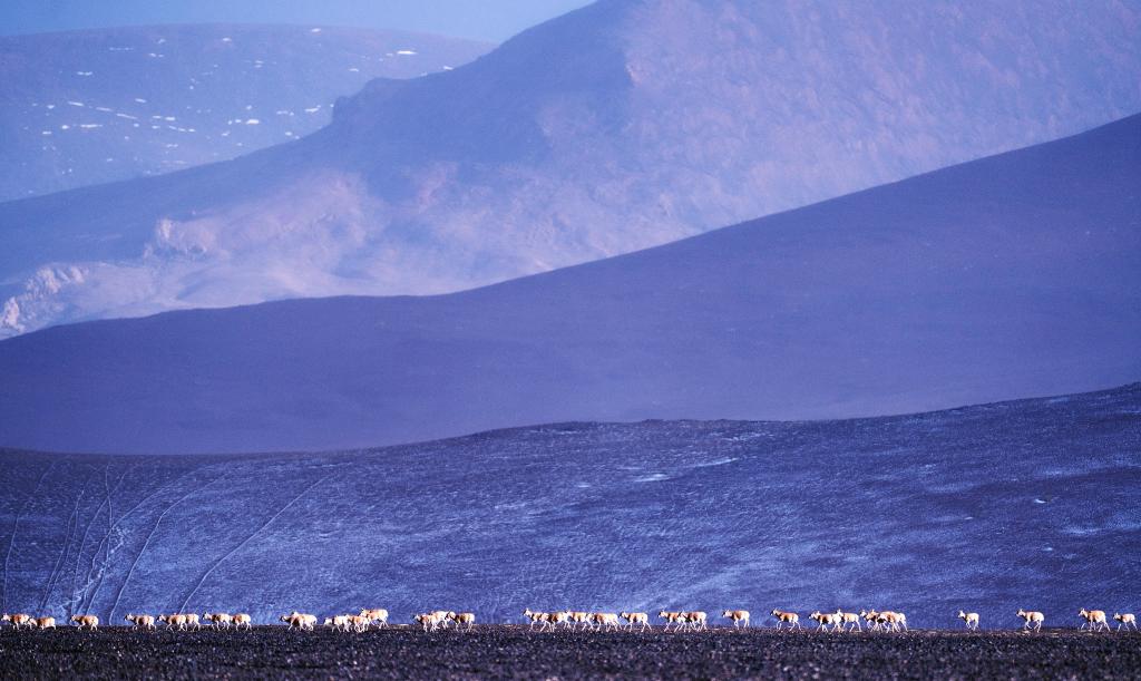 6月15日清晨在羌塘國家級自然保護區(qū)拍攝的遷徙中的母藏羚羊。