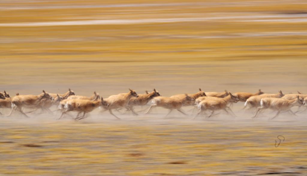 6月13日,在羌塘國家級自然保護區(qū),遷徙中的藏羚羊奔跑起來。