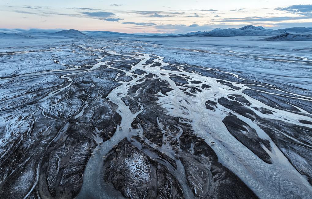 在甜水河畔荒灘雪地中向產(chǎn)羔地遷徙的藏羚羊(6月14日攝)。