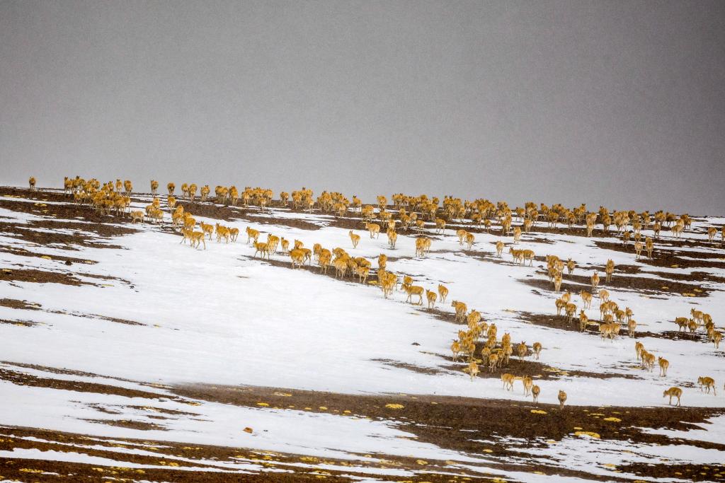 大群遷徙的藏羚羊翻越覆蓋著積雪的山梁(5月10日攝)。