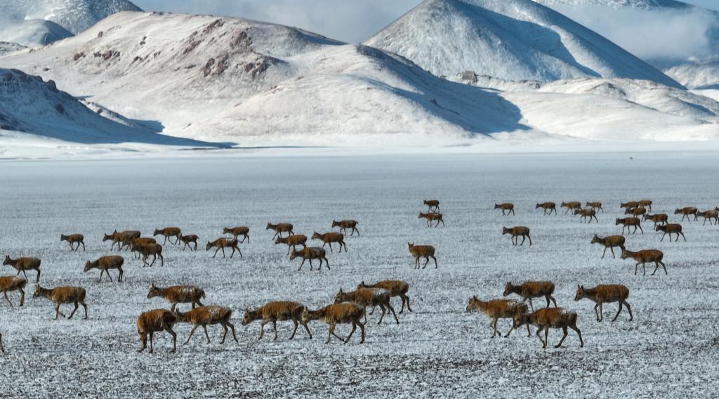一場(chǎng)雪在清晨,同事帶著迷彩布去拍攝藏羚羊了,他們成功了——隨著太陽升起,藏羚羊群悠然現(xiàn)身。“最近的時(shí)候離我們只有20米!”他們告訴我。