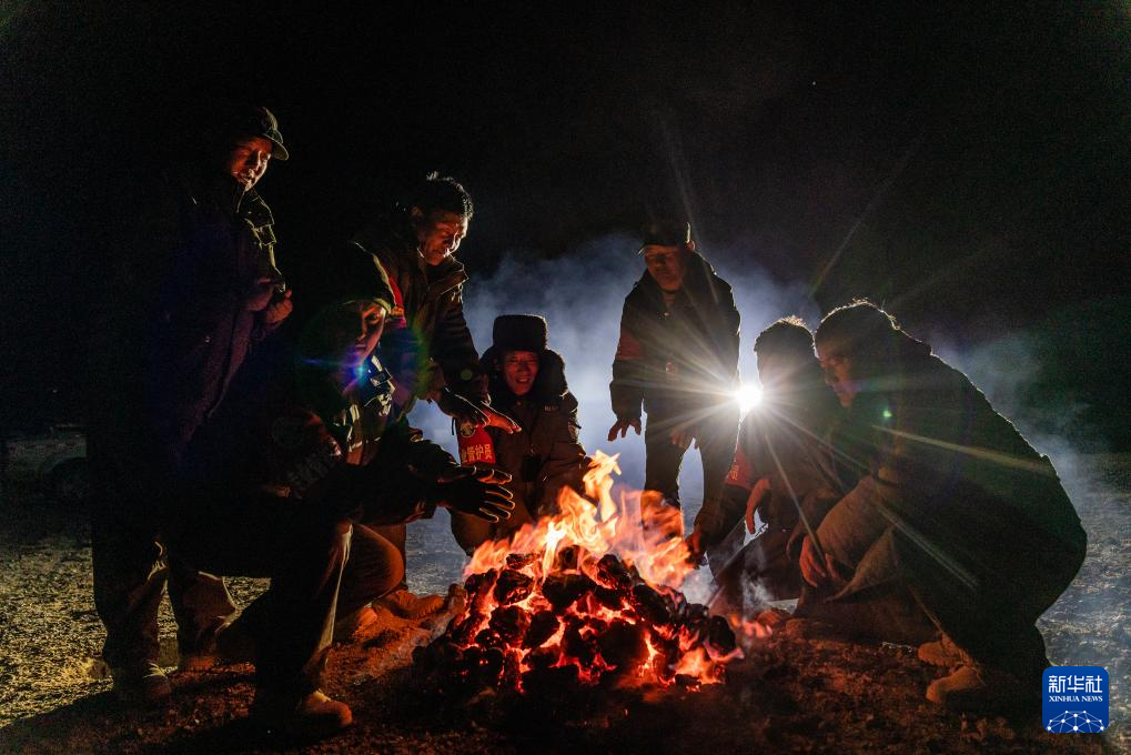 5月10日,野生動物專業(yè)管護隊員在宿營地用野牦牛糞烤火取暖。新華社記者 丁增尼達 攝