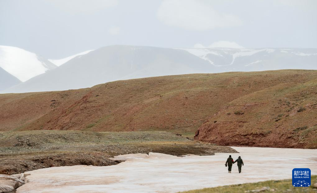 6月15日,羌塘國家級自然保護區(qū)野生動物專業(yè)管護隊員索朗(右)和羅布檢查河面冰凍情況。新華社記者 費茂華 攝