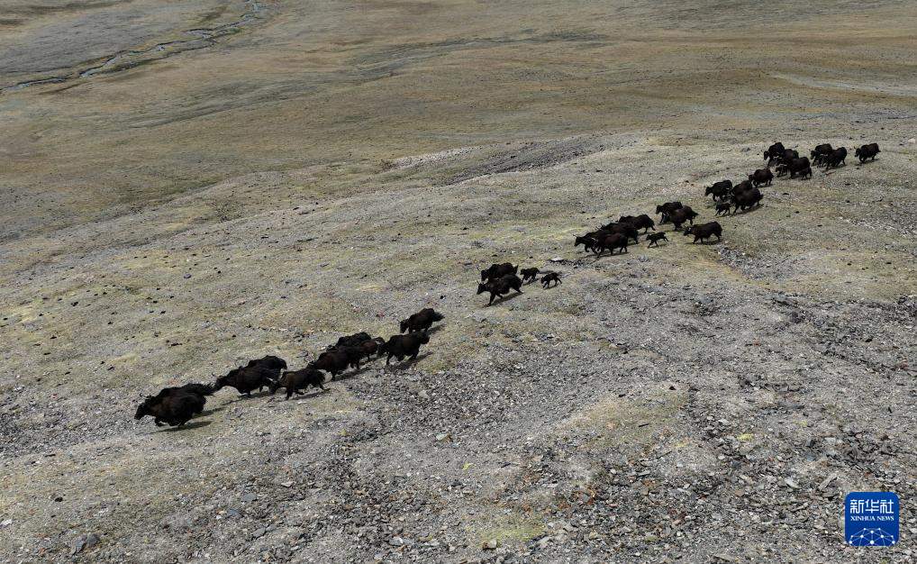 這是在那曲市尼瑪縣拍攝的野牦牛群,其中有剛出生不久的小牛犢(無人機(jī)照片,6月15日攝)。新華社記者 旦增尼瑪曲珠 攝