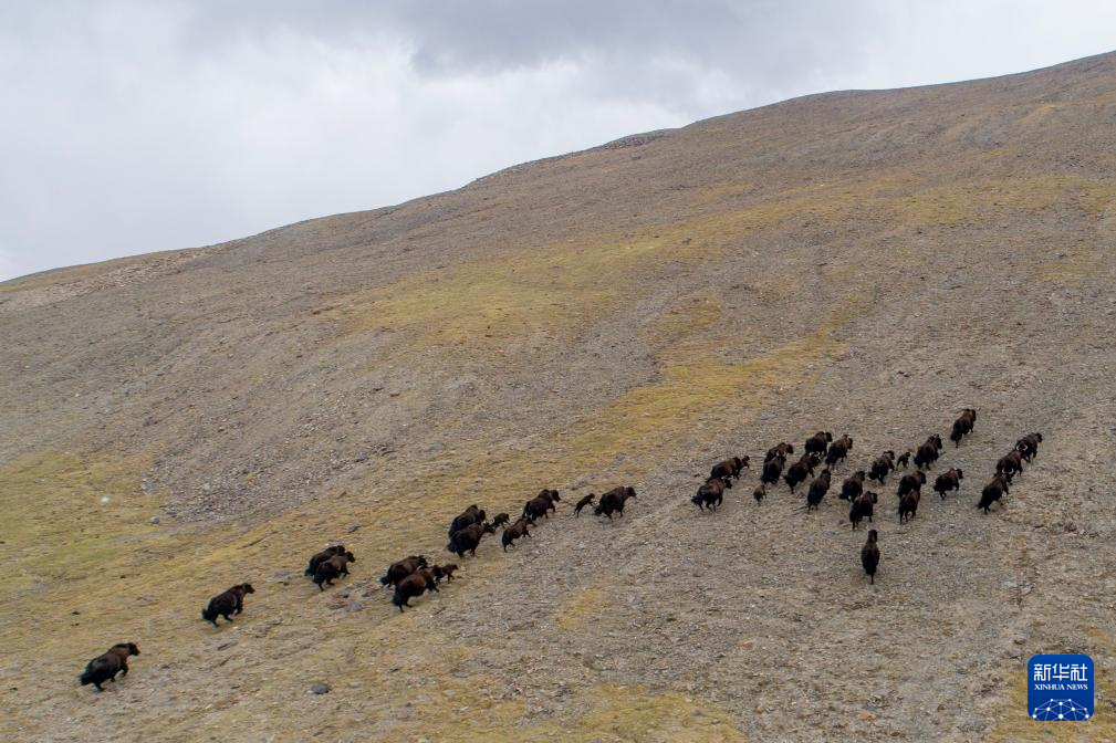 這是在那曲市尼瑪縣拍攝的野牦牛群,其中有剛出生不久的小牛犢(無人機(jī)照片,6月15日攝)。新華社記者 晉美多吉 攝