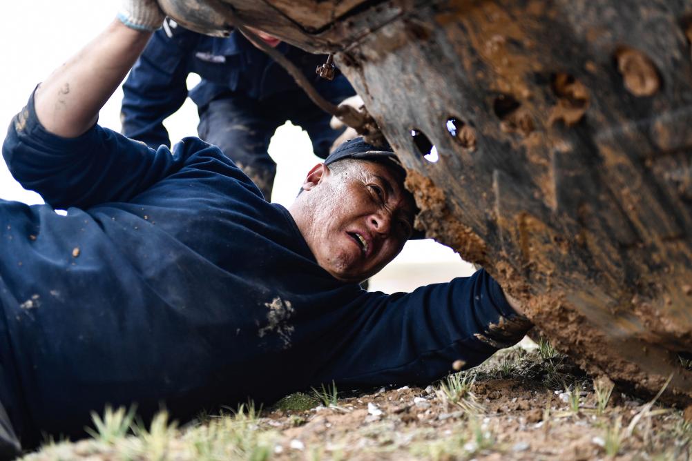 2020年7月6日,卓乃湖保護(hù)站站長(zhǎng)秋培扎西在可可西里地區(qū)修理車(chē)輛。新華社記者 張龍 攝