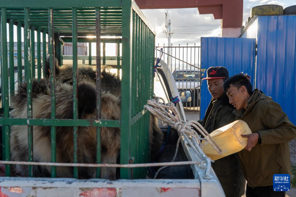 野保隊員在西藏那曲市尼瑪縣羅布玉杰野生動物管護站為放歸棕熊做準(zhǔn)備(8月30日攝)。新華社記者 姜帆 攝
