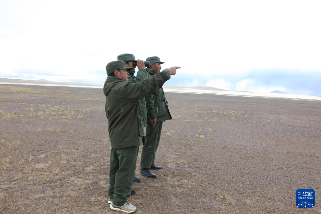 野生動物專業(yè)管護隊員在令戈錯旁巡護(9月8日攝)。新華社記者 劉詩平 攝