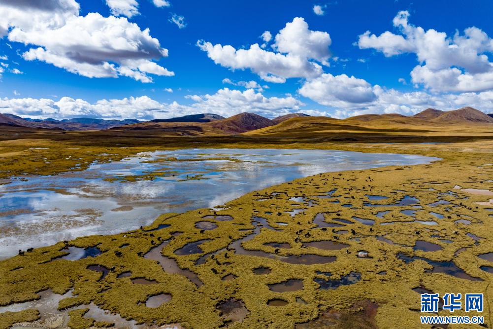 10月6日,在西藏自治區(qū)那曲市嘉黎縣境內(nèi)拍攝的牦牛(無人機照片)。新華網(wǎng) 旦增努布 攝