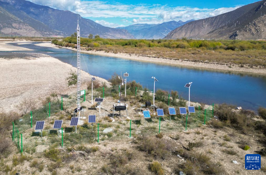 這是在林芝雅尼國家濕地公園尼洋河畔拍攝的生態(tài)監(jiān)測系統(tǒng)(10月24日攝,無人機照片)。新華社記者 劉天宇 攝