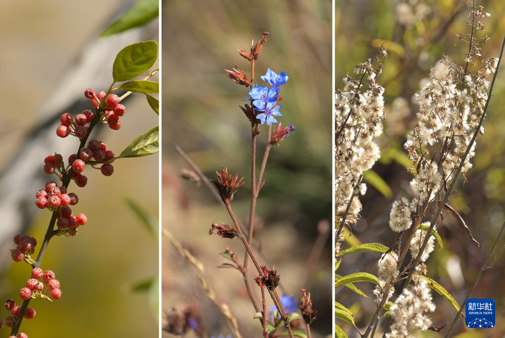 這是10月24日在西藏林芝雅尼國家濕地公園內(nèi)拍攝的植物(拼版照片)。新華社記者 李賀 攝