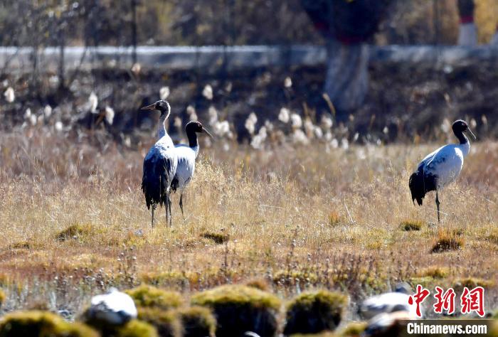 圖為11月3日,黑頸鶴在西藏拉薩達(dá)孜區(qū)棲息。中新社記者 李林 攝