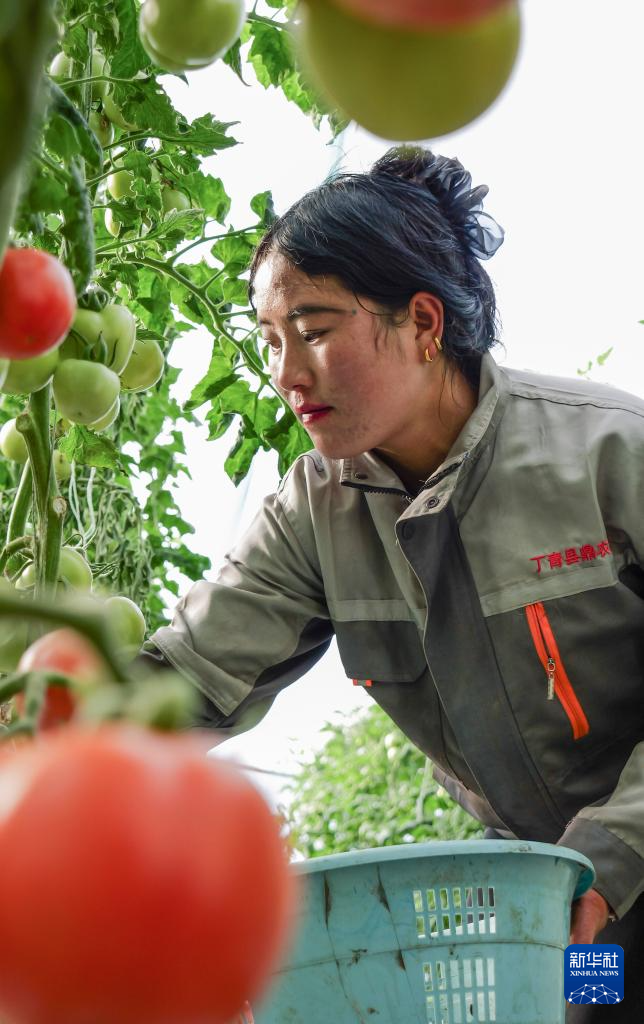 11月22日,在丁青縣農(nóng)業(yè)生態(tài)產(chǎn)業(yè)園,工作人員在采摘西紅柿。新華社記者 格桑朗杰 攝