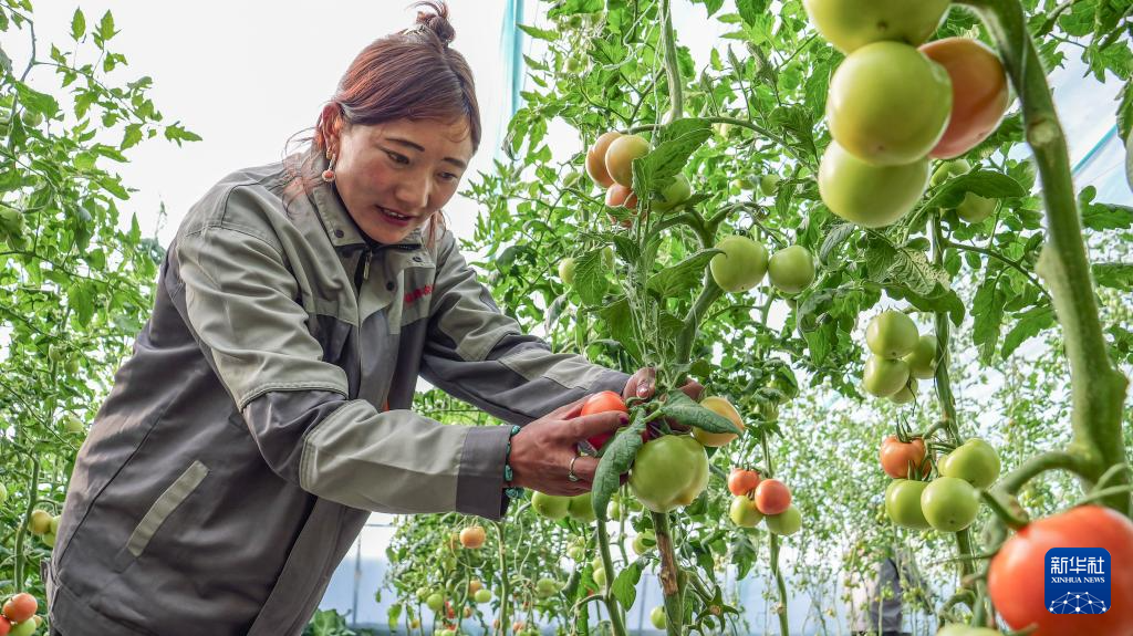 11月22日,在丁青縣農(nóng)業(yè)生態(tài)產(chǎn)業(yè)園,工作人員在采摘西紅柿。新華社記者 楊帆 攝