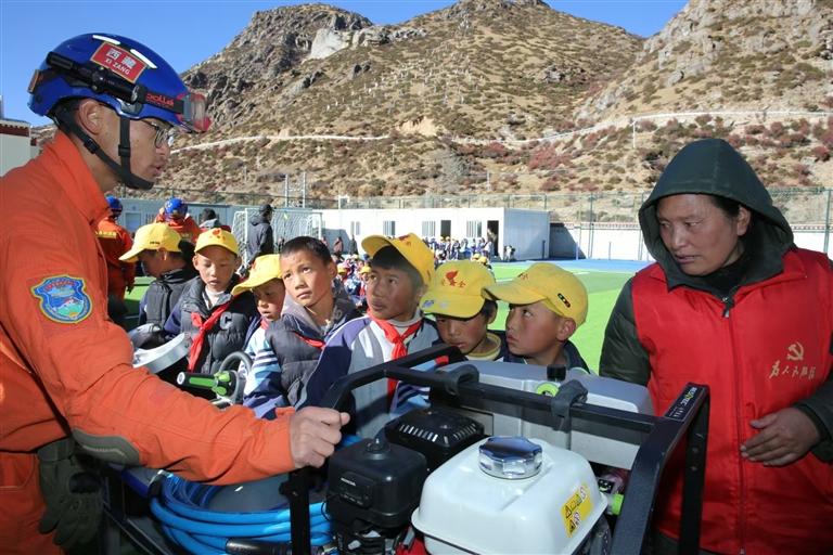消防員向師生普及地震應(yīng)急避險(xiǎn)常識(shí)。記者 格桑倫珠 通訊員 仁青卓瑪 攝