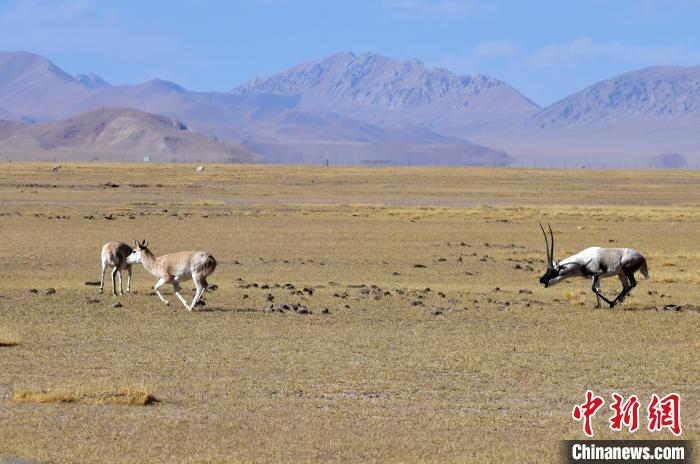 圖為12月8日,棲息在魯確塘草原的雄性藏羚羊正在追逐雌性藏羚羊。中新社記者 李林 攝