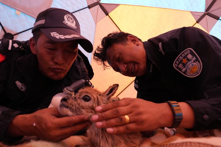 在可可西里無人區(qū)腹地卓乃湖附近,巡山隊(duì)隊(duì)員尼瑪扎西(左)秋松多杰(右)給剛救助的小藏羚羊喂奶(2024年7月8日攝)。新華社發(fā)(杜笑微攝)