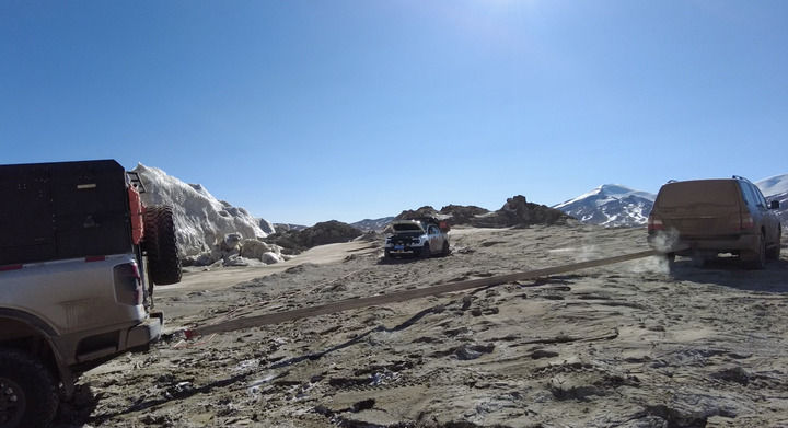 可可西里巡山隊(duì)隊(duì)員在巡山過程中用拖車?yán)K拉出被困車輛(2025年1月14日攝)。新華社發(fā)(杜笑微攝)